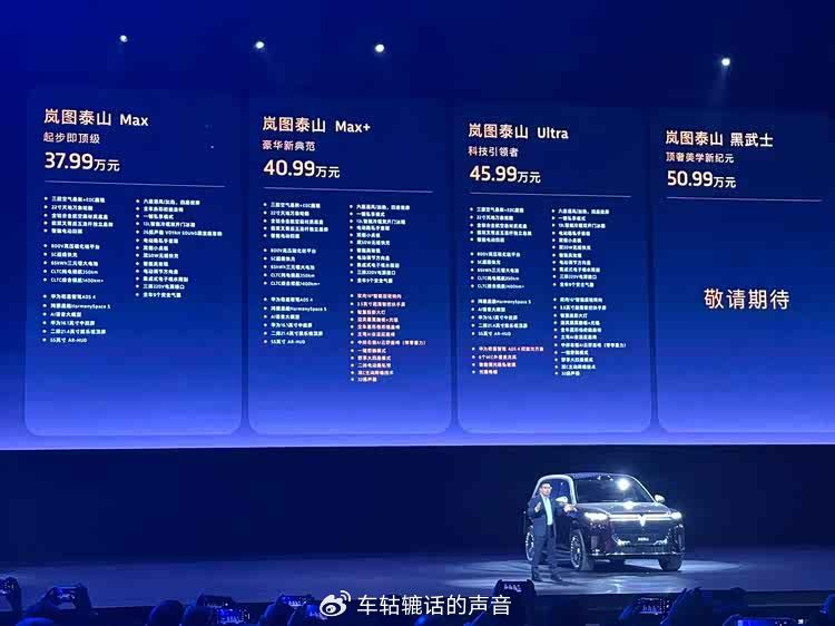 2025年11月18日,汽車宣布旗下的豪華大六座SUV——泰山正式上市,新車共推出三款車型,售價區間為37.99萬至45.99萬元。另外,新車還推出黑武士版車型,限量發售。嵐圖泰山作為嵐圖的旗艦型SUV,它基于800V高壓平臺打造,搭載1.5T插混系統,配備容量65度的三元鋰電池,CLTC純電續航370公里,綜合續航1400公里,并搭載三腔空懸、EDC魔毯功能和后輪轉向系統。此外,新車還配備華為乾崑ADS 4和鴻蒙座艙5,配有4顆激光雷達。