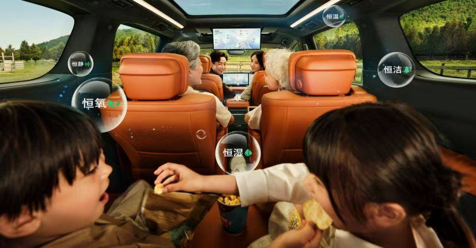 行業(yè)首創(chuàng)的 五恒 大健康座艙是最大亮點(diǎn),實(shí)現(xiàn)恒溫、恒濕、恒氧、恒潔、恒靜的全方位健康守護(hù)。座艙搭載同級獨(dú)有的松下 nanoe™X 凈化技術(shù),能快速凈化 PM2.5,抗病毒濾網(wǎng)滅活率達(dá) 99.99%;座椅皮革通過全球最高標(biāo)準(zhǔn) OEKO-TEX 嬰兒級認(rèn)證,嬰幼兒啃咬也安全,座艙電磁輻射值比手機(jī)更低,備孕家庭、敏感人群均可放心乘坐。此外,1.1 米超長智慧頂燈通過南德 TÜV 護(hù)眼認(rèn)證,前后排屏幕均符合萊茵 TÜV 低藍(lán)光標(biāo)準(zhǔn),長時(shí)間乘車也能保護(hù)視力。
